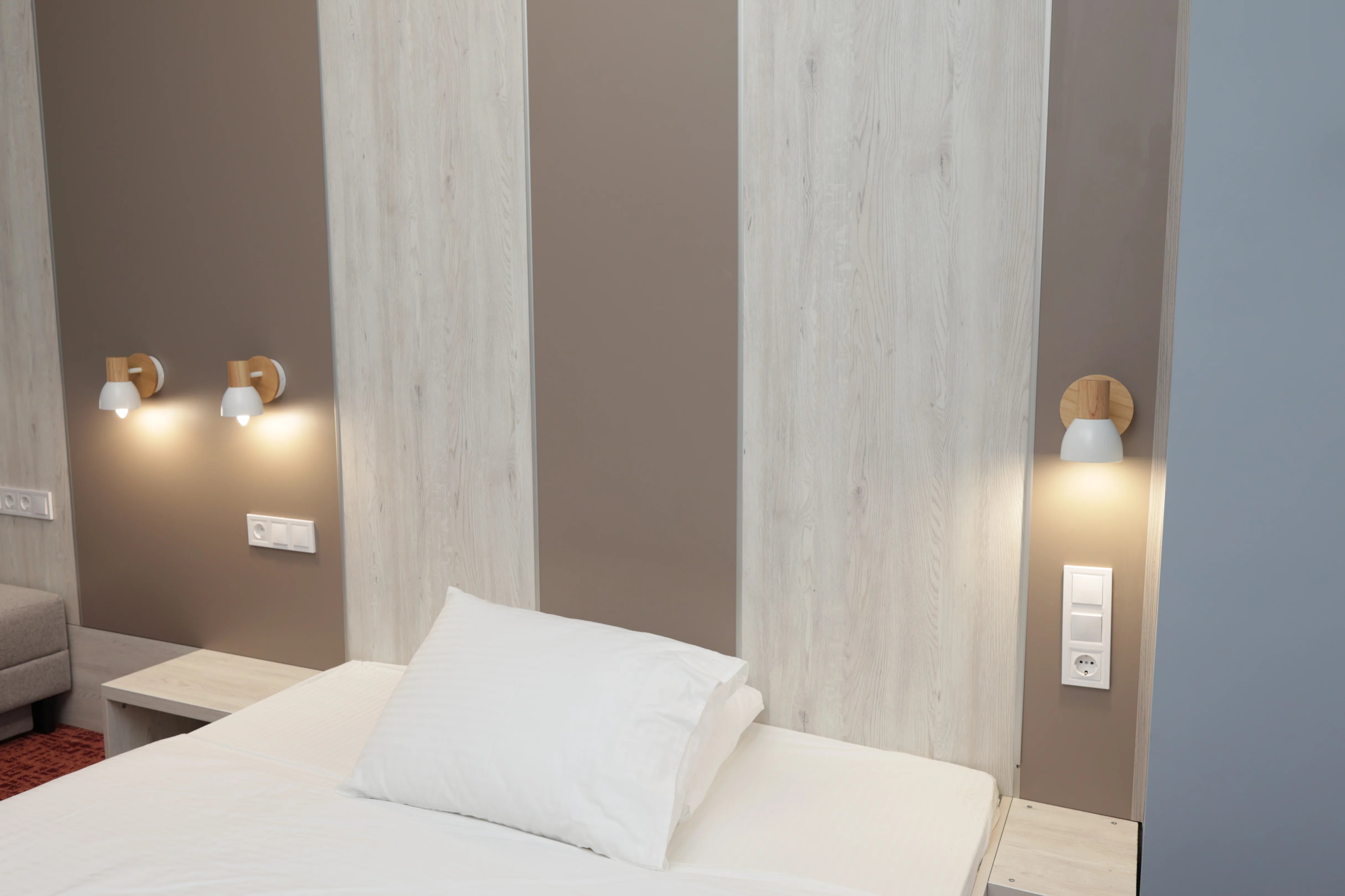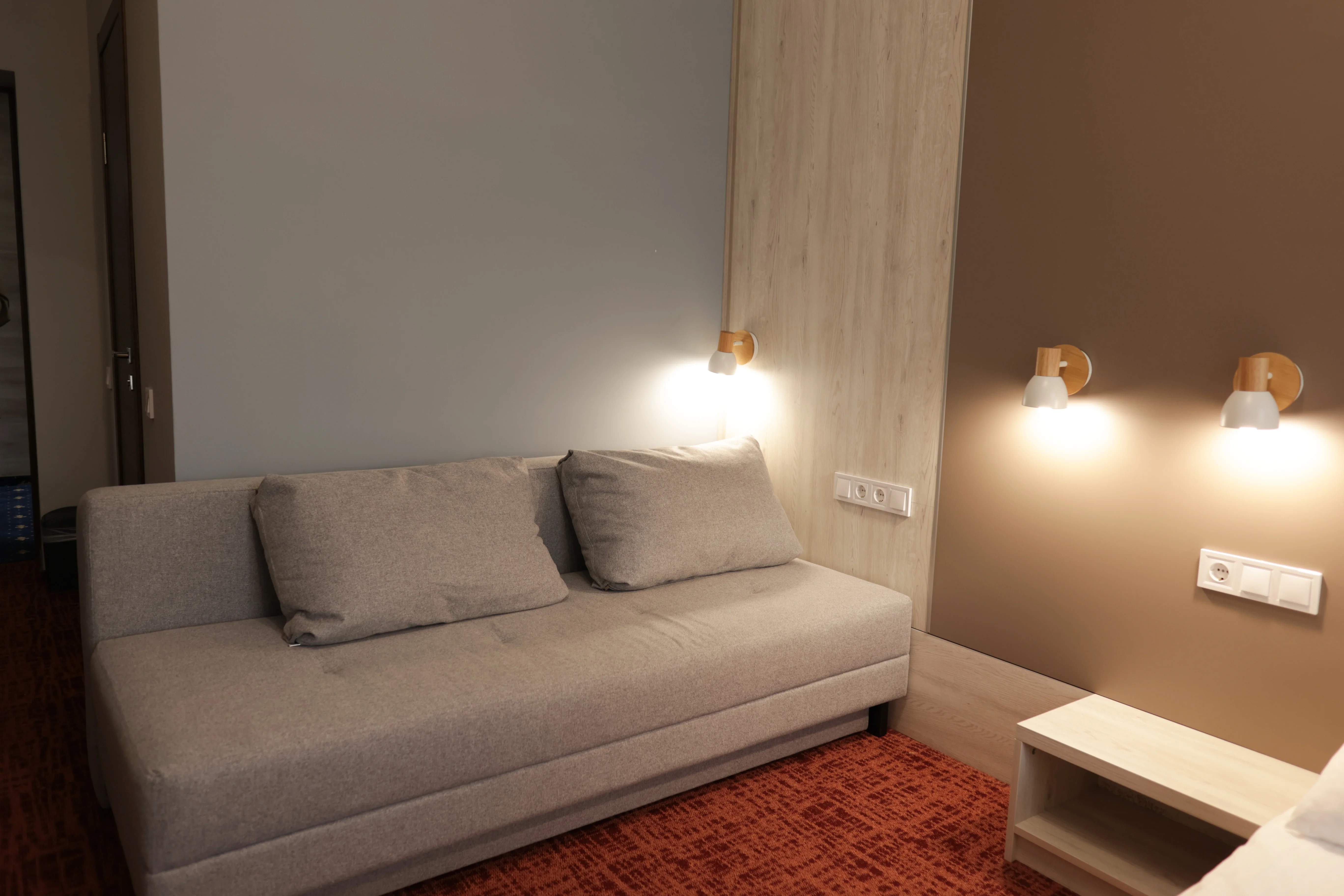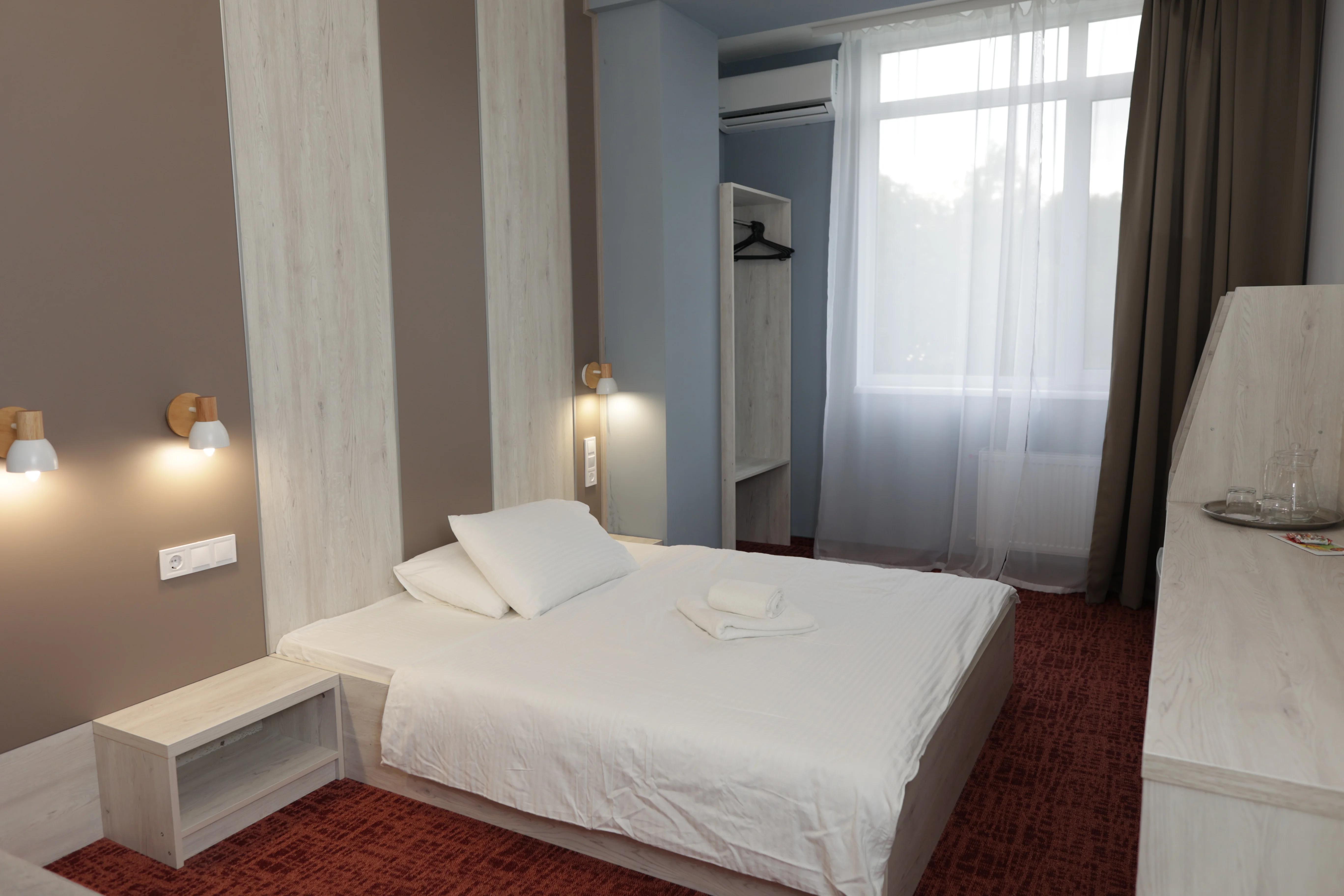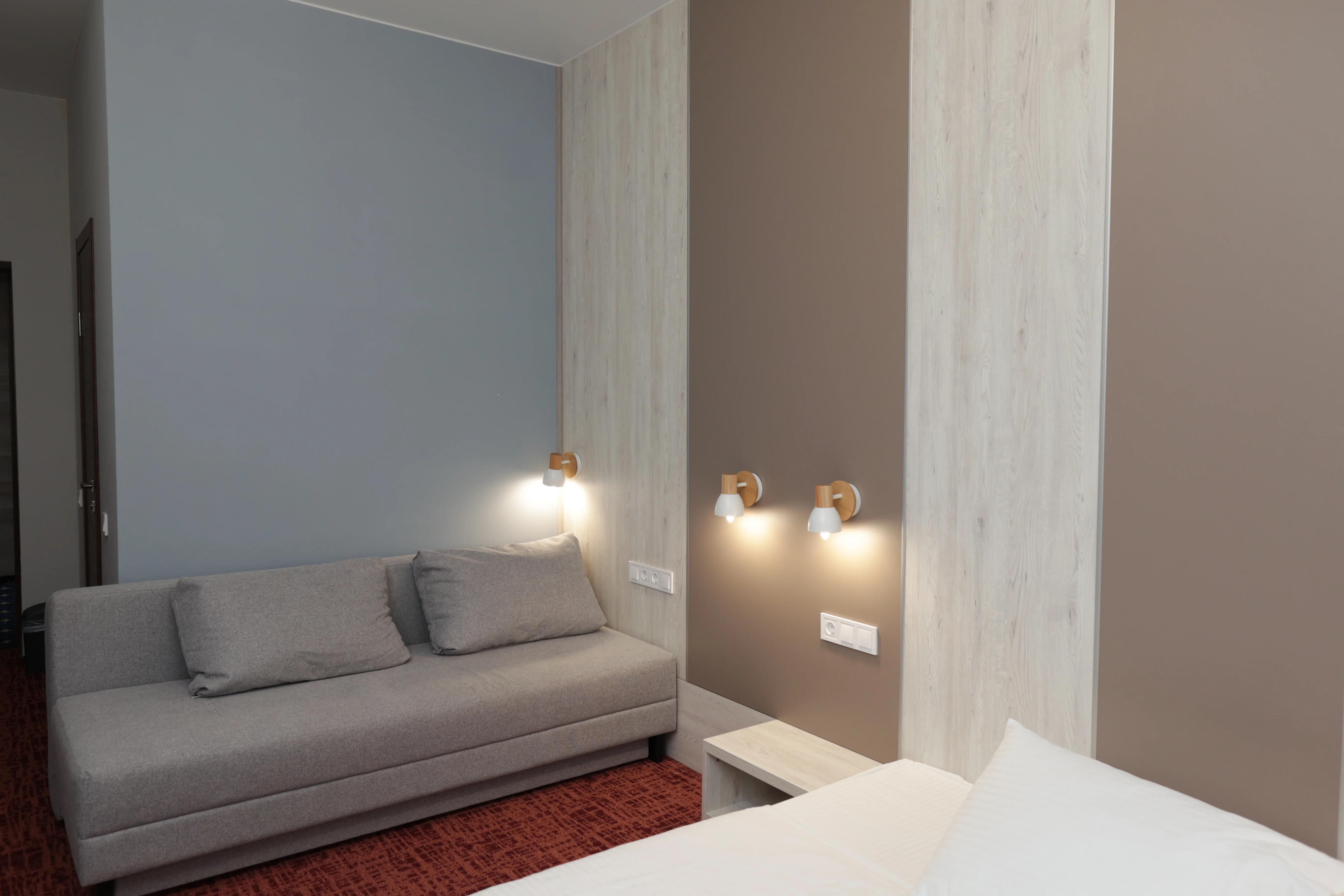 Элегантный номер 20м² для одного гостя с большой двуспальной кроватью (190х160см) и комфортным диваном (190х140см).