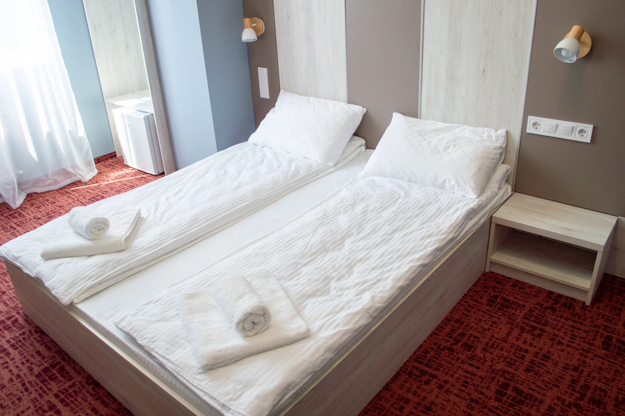 Комфортный вариант для двоих: номер 19м², оборудован двуспальной кроватью (190х160см) и диваном или односпальной кроватью (190х90см).
